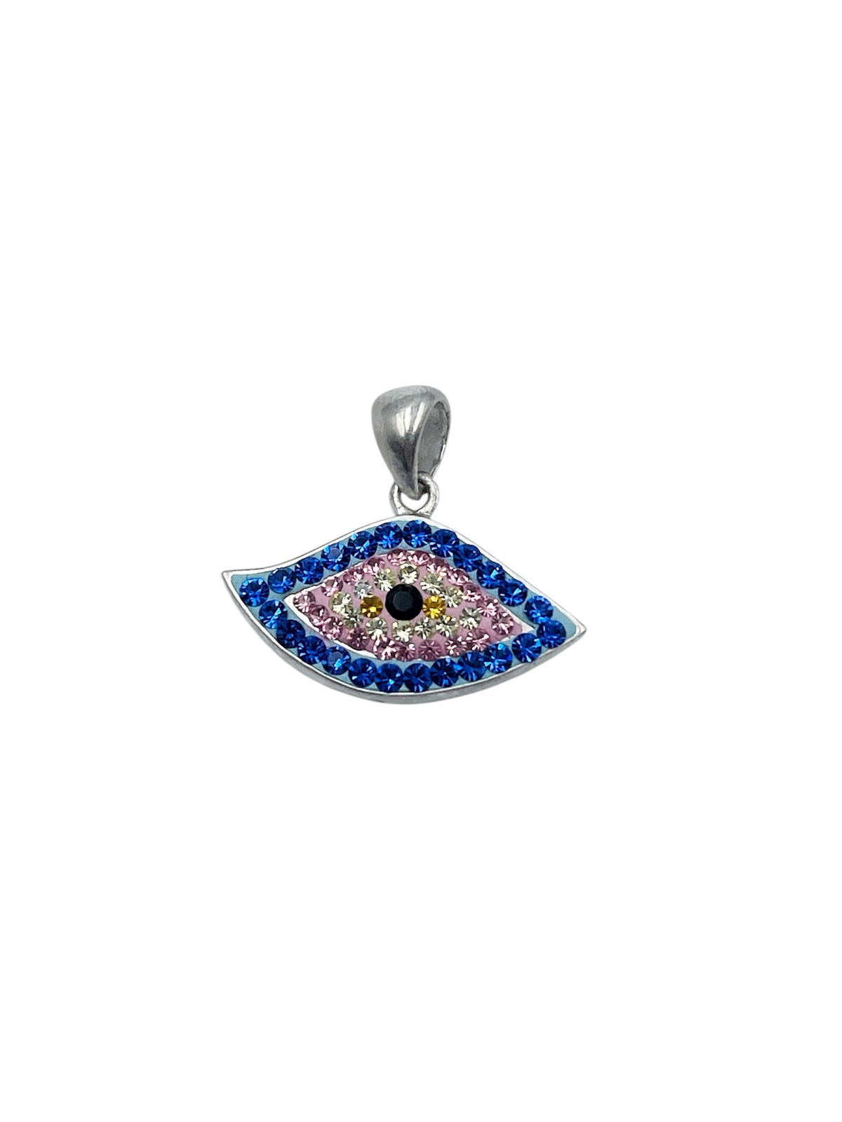 Αυτό το υπέροχο ασημένιο μενταγιόν, διακοσμημένο με λαμπερά ζιργκόν σε αποχρώσεις μπλε, ροζ και χρυσού, συνδυάζει κομψότητα και σύγχρονη αισθητική. Το κεντρικό μαύρο ζιργκόν δίνει ένταση και δημιουργεί την ξεχωριστή όψη του «ματιού», ιδανικό τόσο ως fashion statement όσο και ως προσωπικό φυλαχτό.