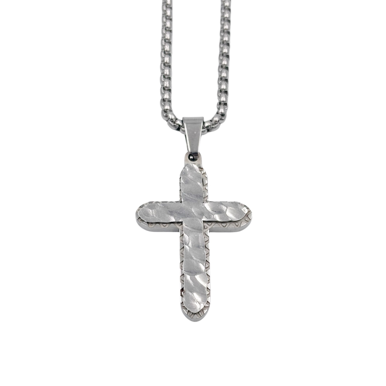 Ανακαλύψτε τη γοητεία του ακατέργαστου σχεδιασμού με αυτόν τον μοναδικό σφυρήλατο σταυρό. Η επιφάνειά του “παίζει” με το φως χάρη στις ανώμαλες, χειροποίητες εσοχές του, δίνοντας την αίσθηση ενός κοσμήματος με ιστορία .Με διπλό επίπεδο (double layer) με σφυρήλατη πρόσοψη και ανάγλυφες λεπτομέρειες στην περίμετρο της βάσης.