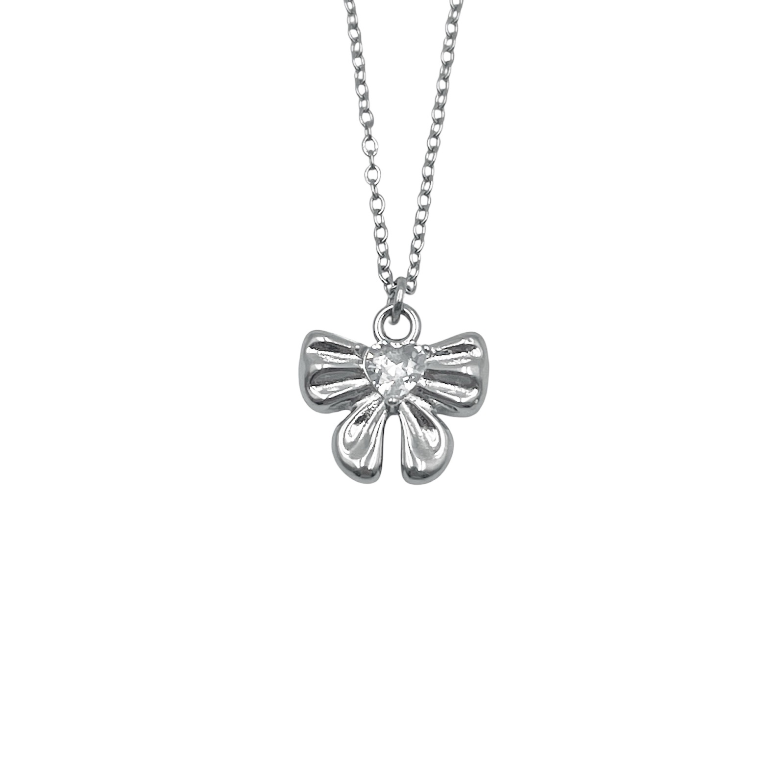 Το Elegant Bow  Silver αποπνέει θηλυκότητα και διακριτική πολυτέλεια. Το ασημί μενταγιόν σε σχήμα φιόγκου, διακοσμημένο στο κέντρο με λαμπερό λευκό ζιργκόν, χαρίζει φως και ρομαντισμό σε κάθε εμφάνιση. Ο συνδυασμός του minimal σχεδίου με τη λεπτή αλυσίδα δημιουργεί ένα κόσμημα που ταιριάζει σε κάθε περίσταση — από καθημερινές εμφανίσεις έως πιο ιδιαίτερες στιγμές.