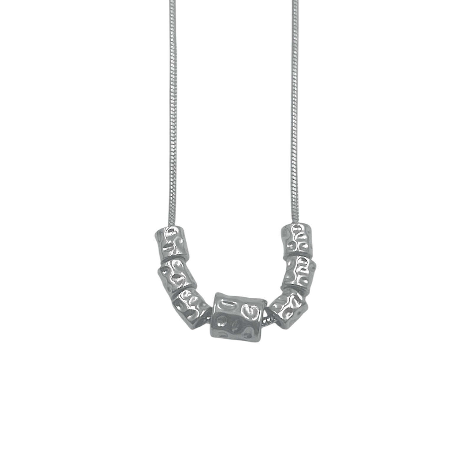 Αυτό το κομψό κολιέ από υψηλής ποιότητας ανοξείδωτο ατσάλι σε ασημί απόχρωση συνδυάζει μοντέρνο ύφος και διακριτική λάμψη. Οι σφυρήλατες ασημί χάντρες δημιουργούν μια εντυπωσιακή υφή που αντανακλά το φως με μοναδικό τρόπο, ενώ ο κεντρικός κυβικός κρίκος δίνει μια αρχιτεκτονική, minimal πινελιά.