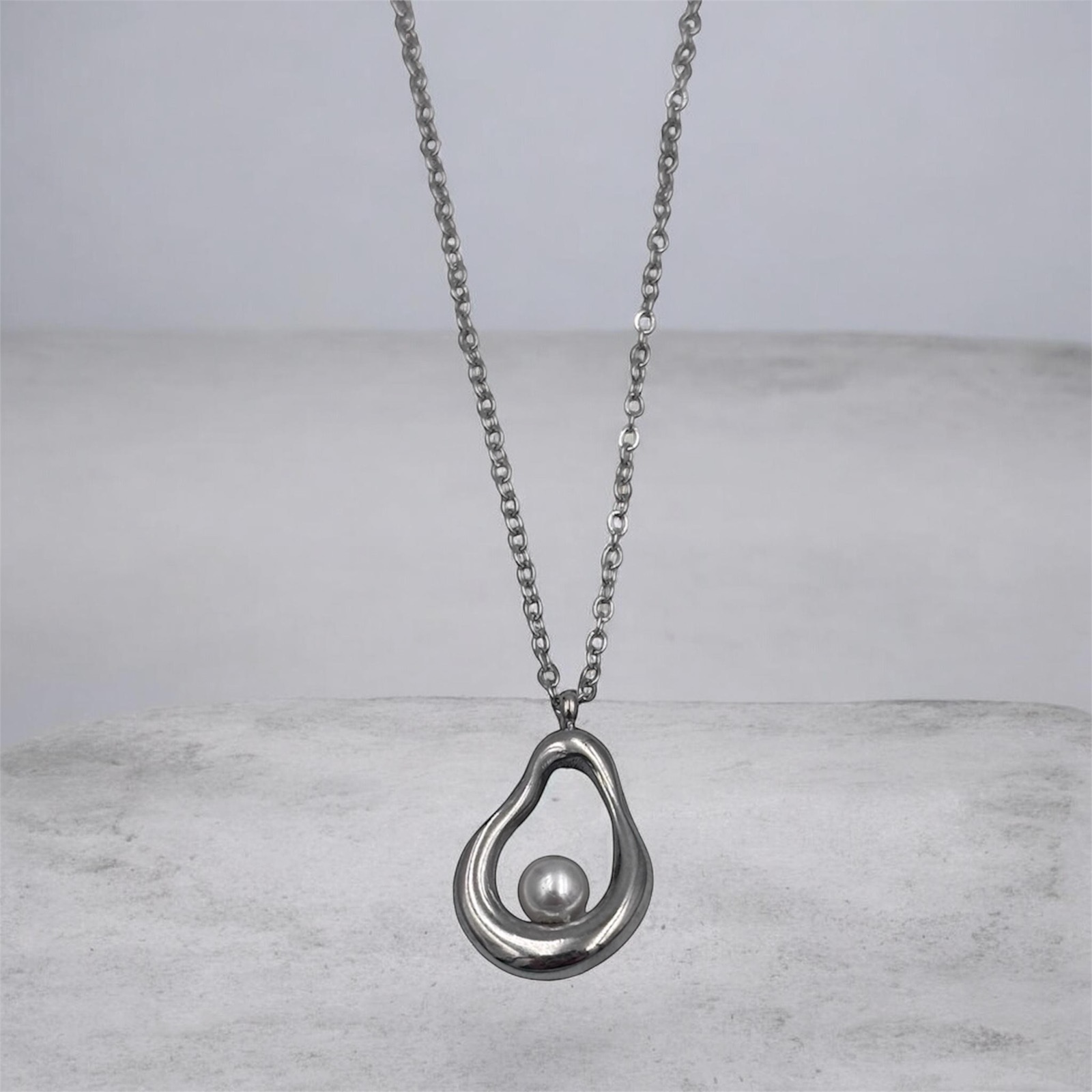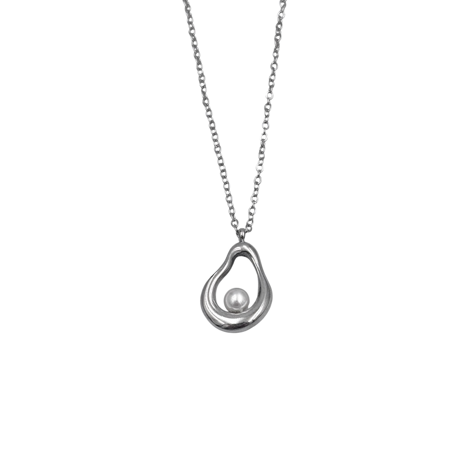 Ανακαλύψτε τη διαχρονική γοητεία με ένα κολιέ που συνδυάζει την κλασική αξία του μαργαριταριού με το σύγχρονο, αφαιρετικό design. Το μενταγιόν “Organic Pearl Drop” είναι σχεδιασμένο για να προσδίδει μια αύρα φυσικής κομψότητας και πολυτέλειας σε κάθε σας εμφάνιση. Το μενταγιόν διαθέτει ένα οργανικό, ασύμμετρο σχήμα σε ασημί τόνο, που θυμίζει σταγόνα ή γλυπτό έργο τέχνης.